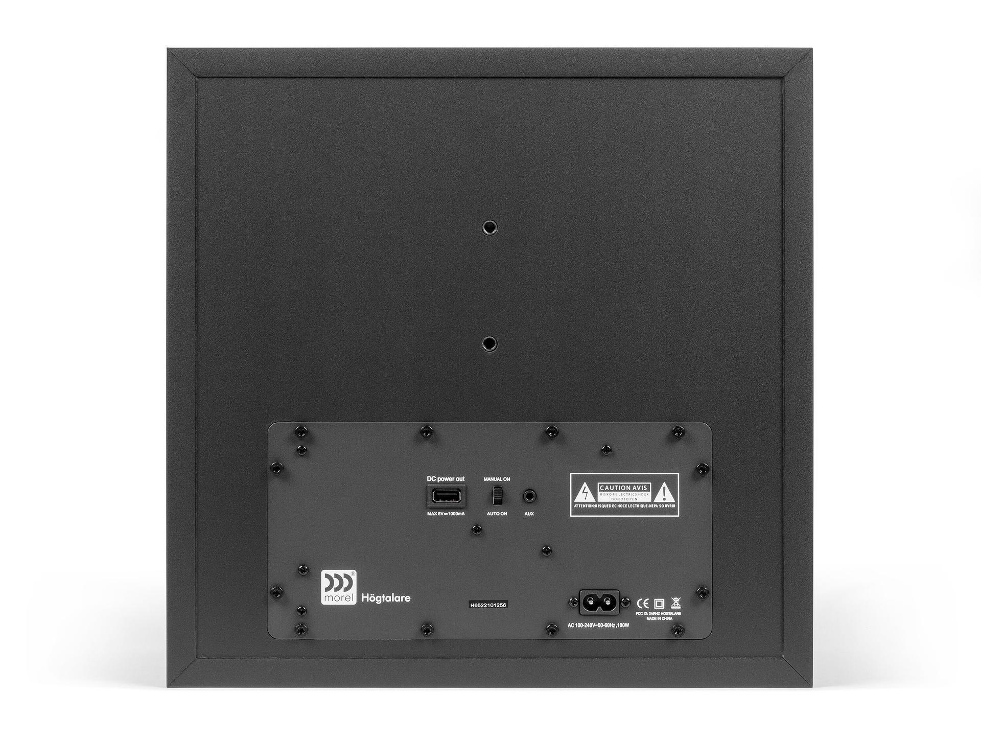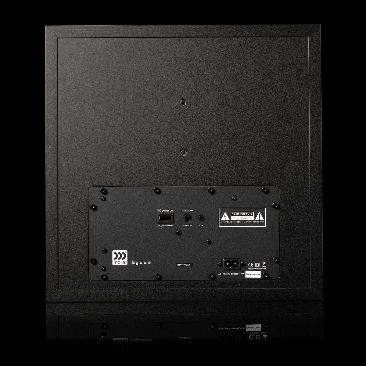 Активная беспроводная колонка в конфигурации 2.1. Плоский корпус для удобного размещения: СЧ-динамик диаметром 6 дюймов с двойным магнитом и два 1-дюймовых твитера с мягким куполом, фазоинвертор на передней панели. Раздельные усилители мощностью по 50 Вт, DSP-обработка сигнала. Bluetooth с поддержкой aptX, вход на разъеме mini-jack. USB-разъем для питания внешних устройств. Габариты (ШхВхГ): 330x330x150 мм.